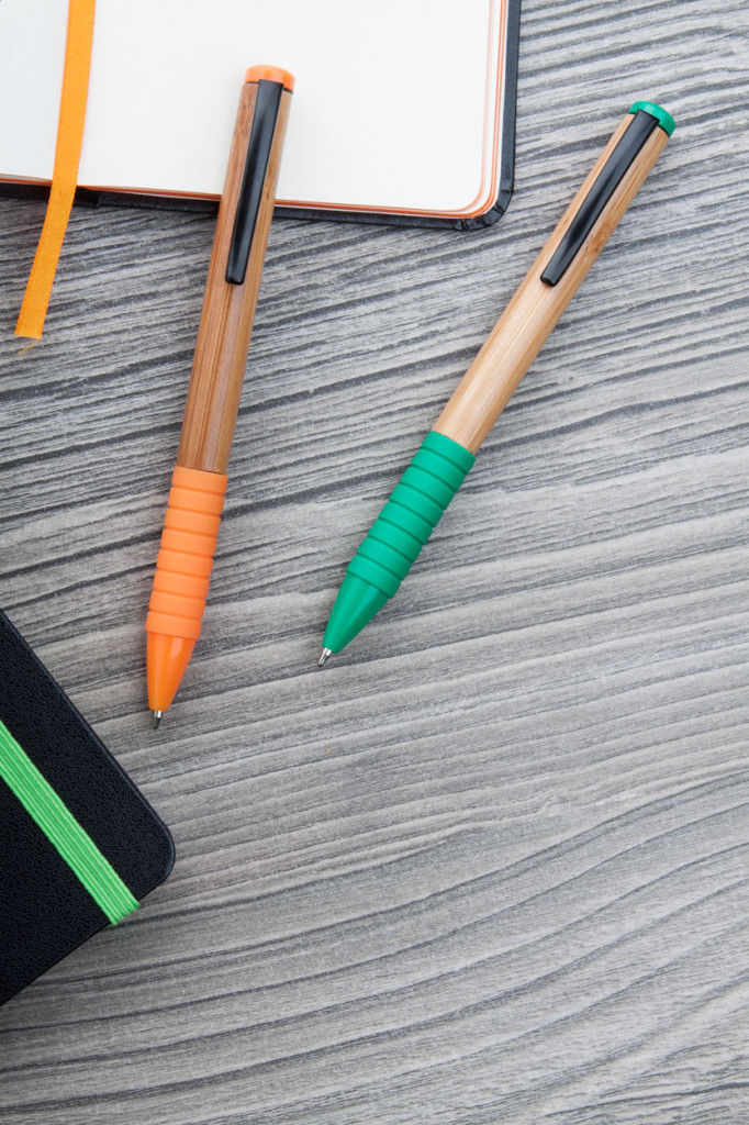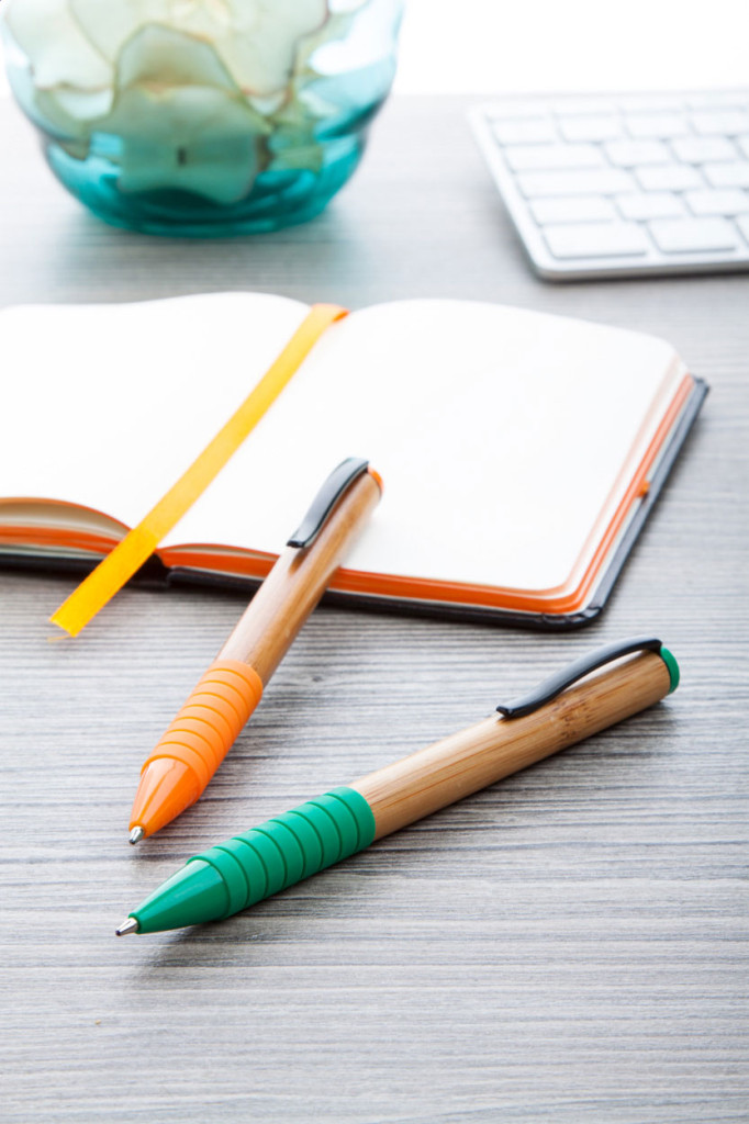 Bambusz, tekerős golyóstoll, fém klipsszel, színes alsó- és felső résszel, illetve egyező színű gumi markolattal. Kék tollbetéttel szállítjuk.