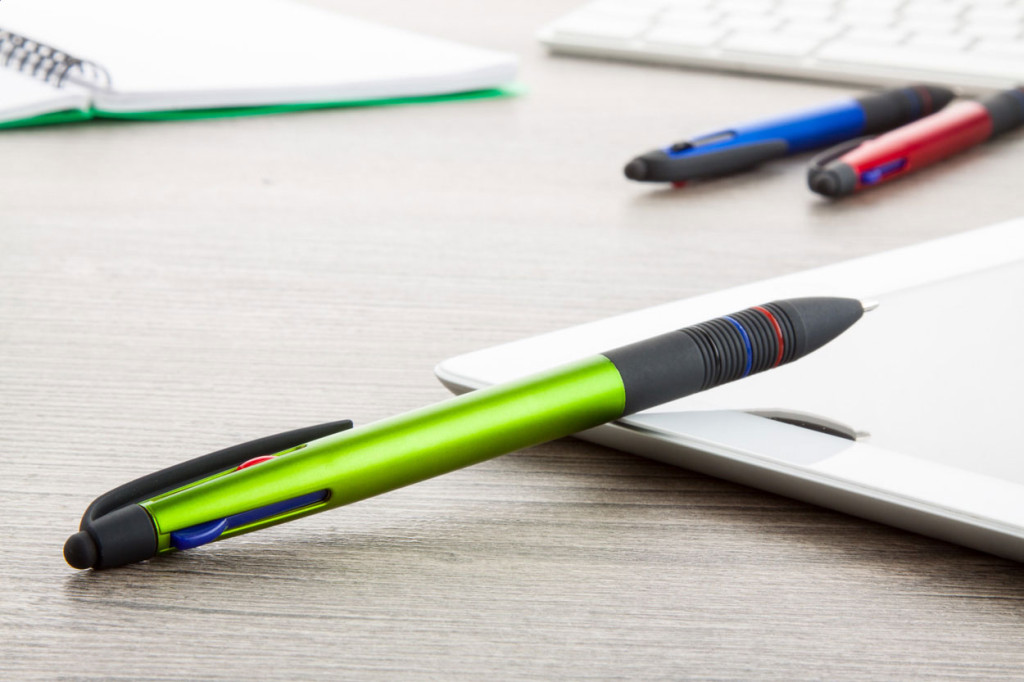 Műanyag golyóstoll érintőképernyős funkcióval, gumi markolattal, fémes matt színben. 3 színű tollbetéttel: fekete, kék és piros.