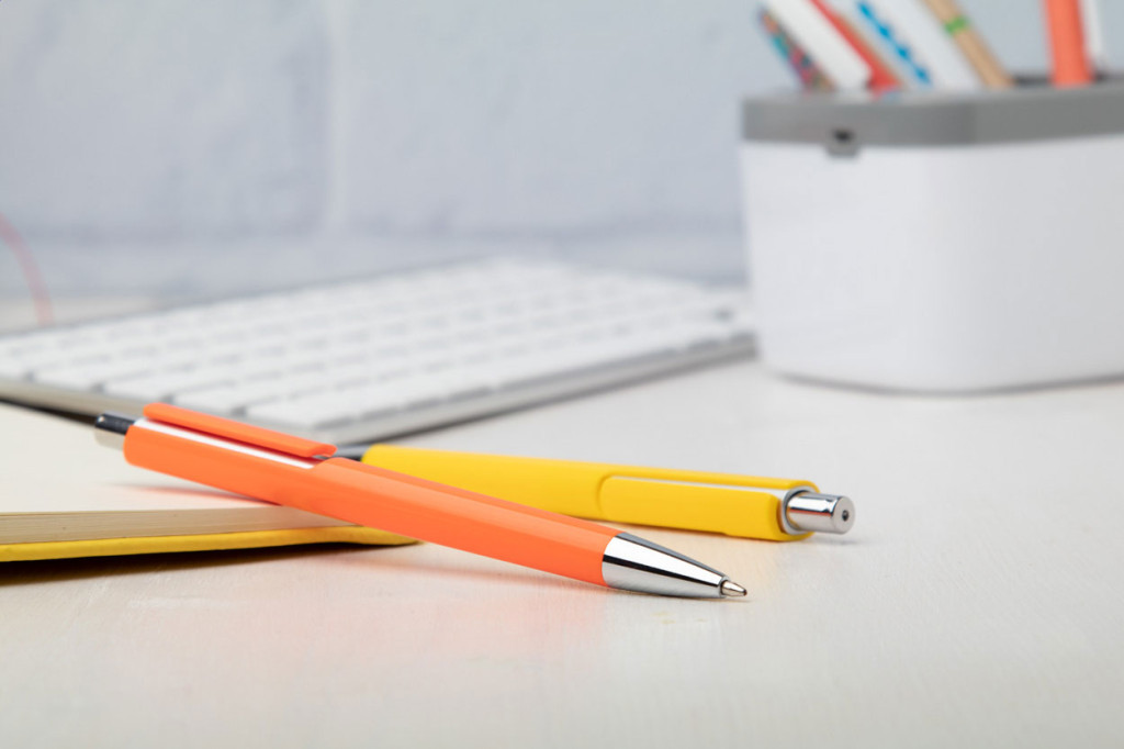 Műanyag golyóstoll színes testtel és króm részekkel. Kék tollbetéttel szállítjuk.