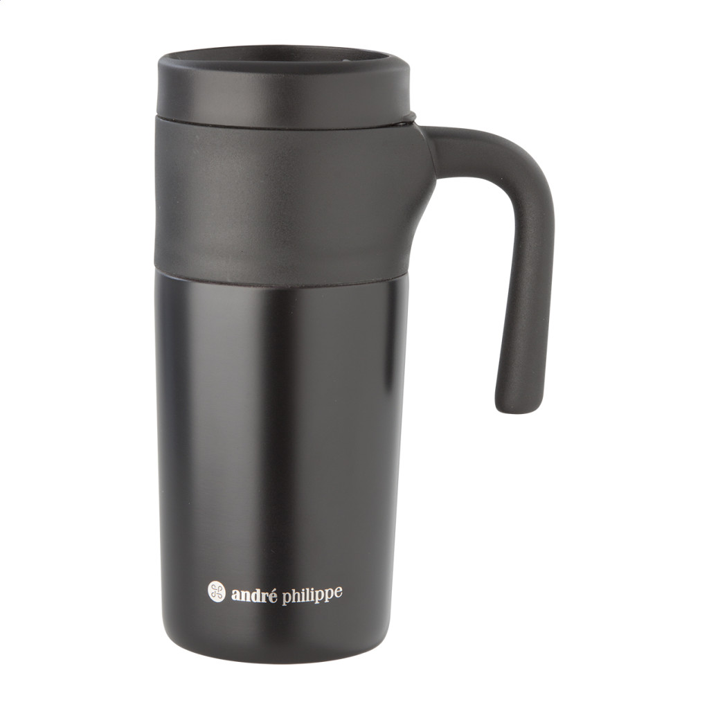 Rozsdamentes acélból készült dupla falú thermo bögre műanyag füllel és ivónyílással a tetején, 330 ml. Fekete karton díszdobozban szállítjuk. André Philippe márkatermék.
