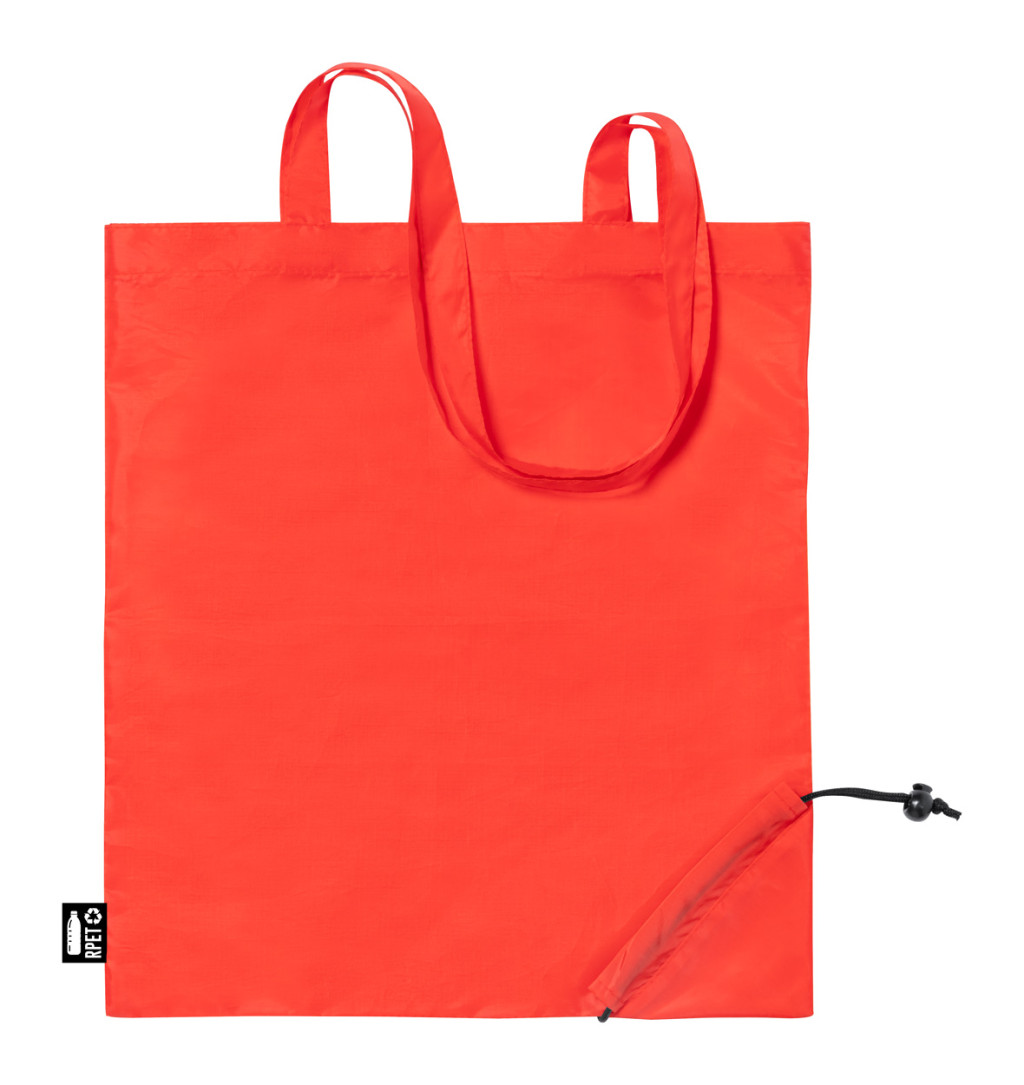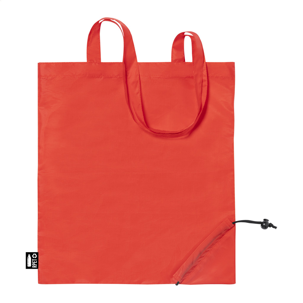 Összehajtható RPET bevásárlótáska hosszú hordfüllel. 190T RPET poliészter, megkülönböztető RPET címkével.