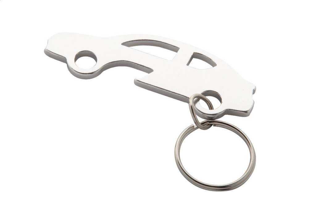 Alumíniumból készült, autó formájú kulcstartó üvegnyitó funkcióval.