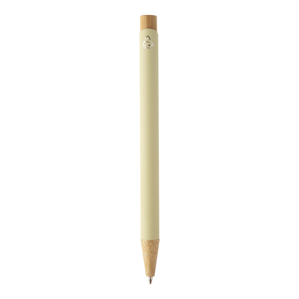 Újrahasznosított alumínium golyóstoll bambusz részekkel, gumírozott felülettel és króm klipsszel. Speciális bevonattal rendelkezik, amely különlegesen fényessé teszi a gravírozott emblémát. Kék tollbetéttel.