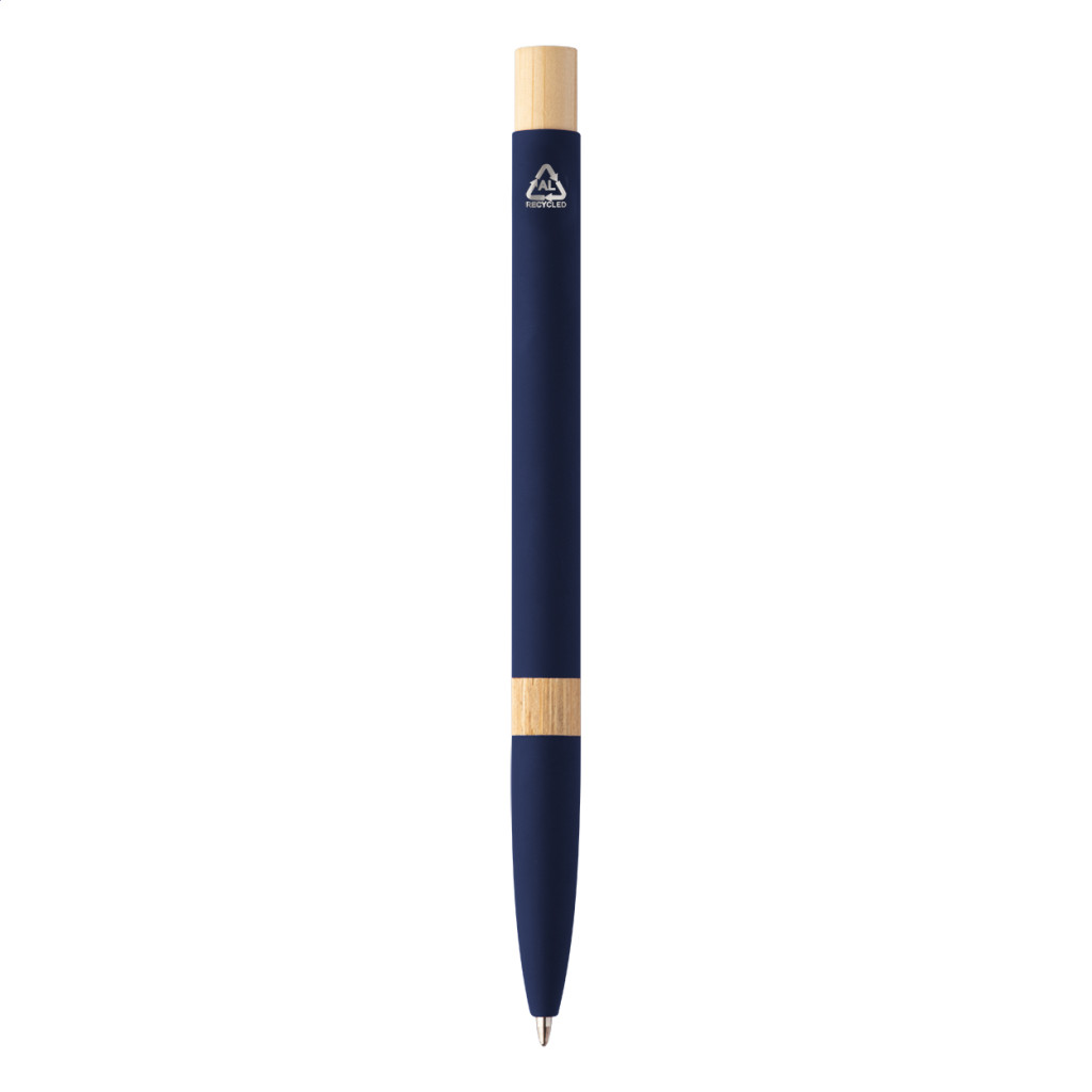 Újrahasznosított alumínium golyóstoll bambusz részekkel, gumírozott felülettel és króm klipsszel. Speciális bevonattal rendelkezik, amely különlegesen fényessé teszi a gravírozott emblémát. Kék tollbetéttel.