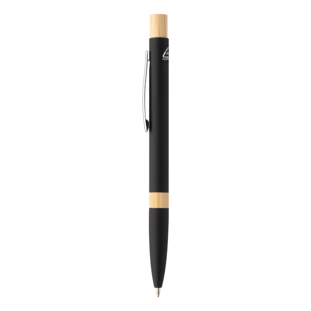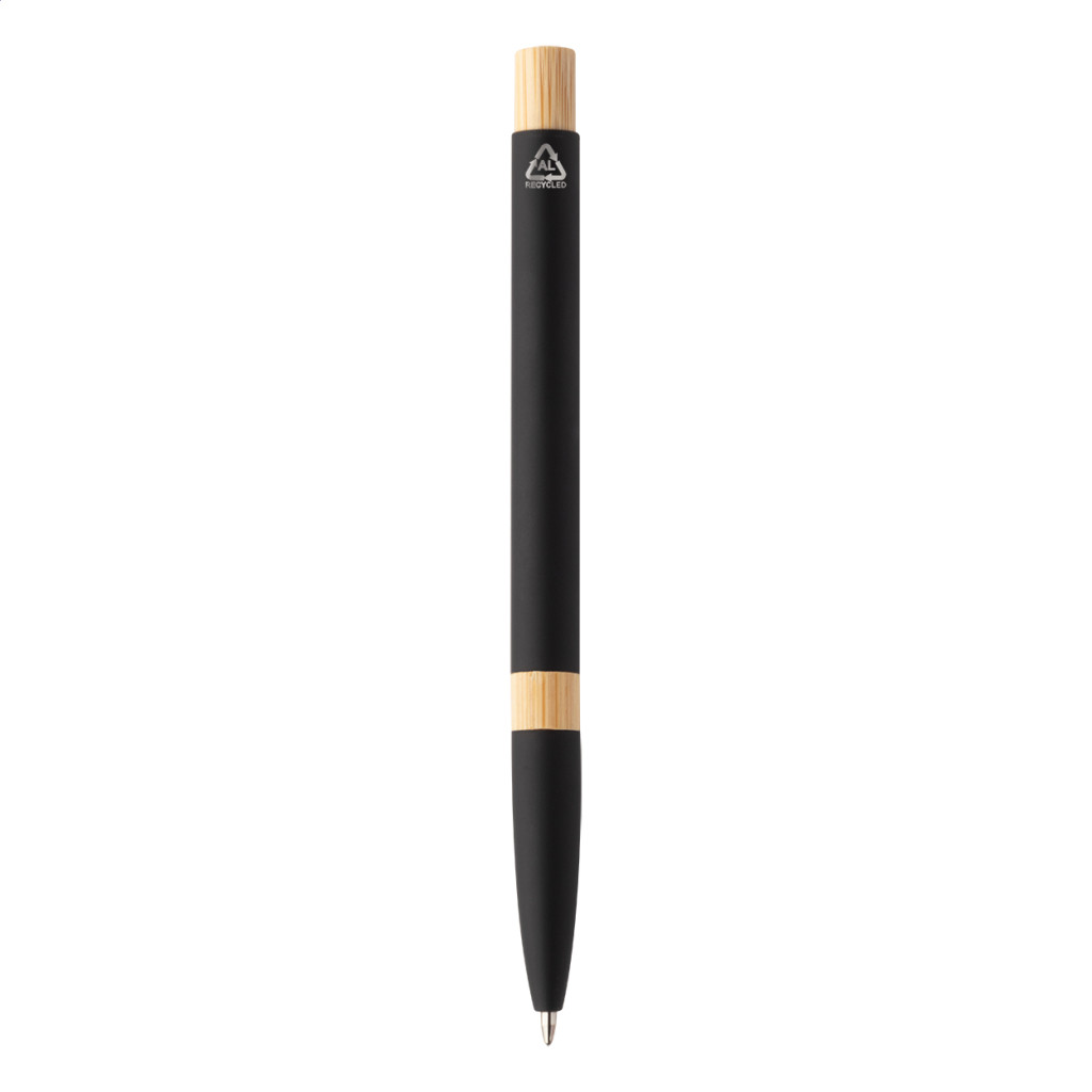 Újrahasznosított alumínium golyóstoll bambusz részekkel, gumírozott felülettel és króm klipsszel. Speciális bevonattal rendelkezik, amely különlegesen fényessé teszi a gravírozott emblémát. Kék tollbetéttel.