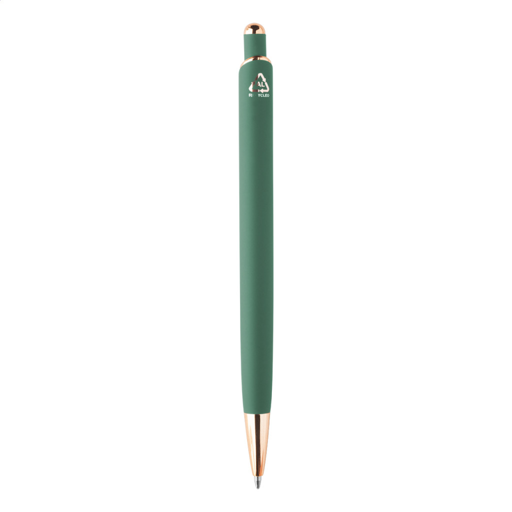 Újrahasznosított alumínium golyóstoll gumírozott felülettel és rózsaarany részletekkel. Speciális bevonattal rendelkezik a rózsaarany színű tükörgravírozáshoz. Kék tollbetéttel.
