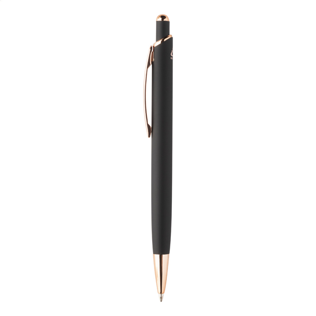 Újrahasznosított alumínium golyóstoll gumírozott felülettel és rózsaarany részletekkel. Speciális bevonattal rendelkezik a rózsaarany színű tükörgravírozáshoz. Kék tollbetéttel.