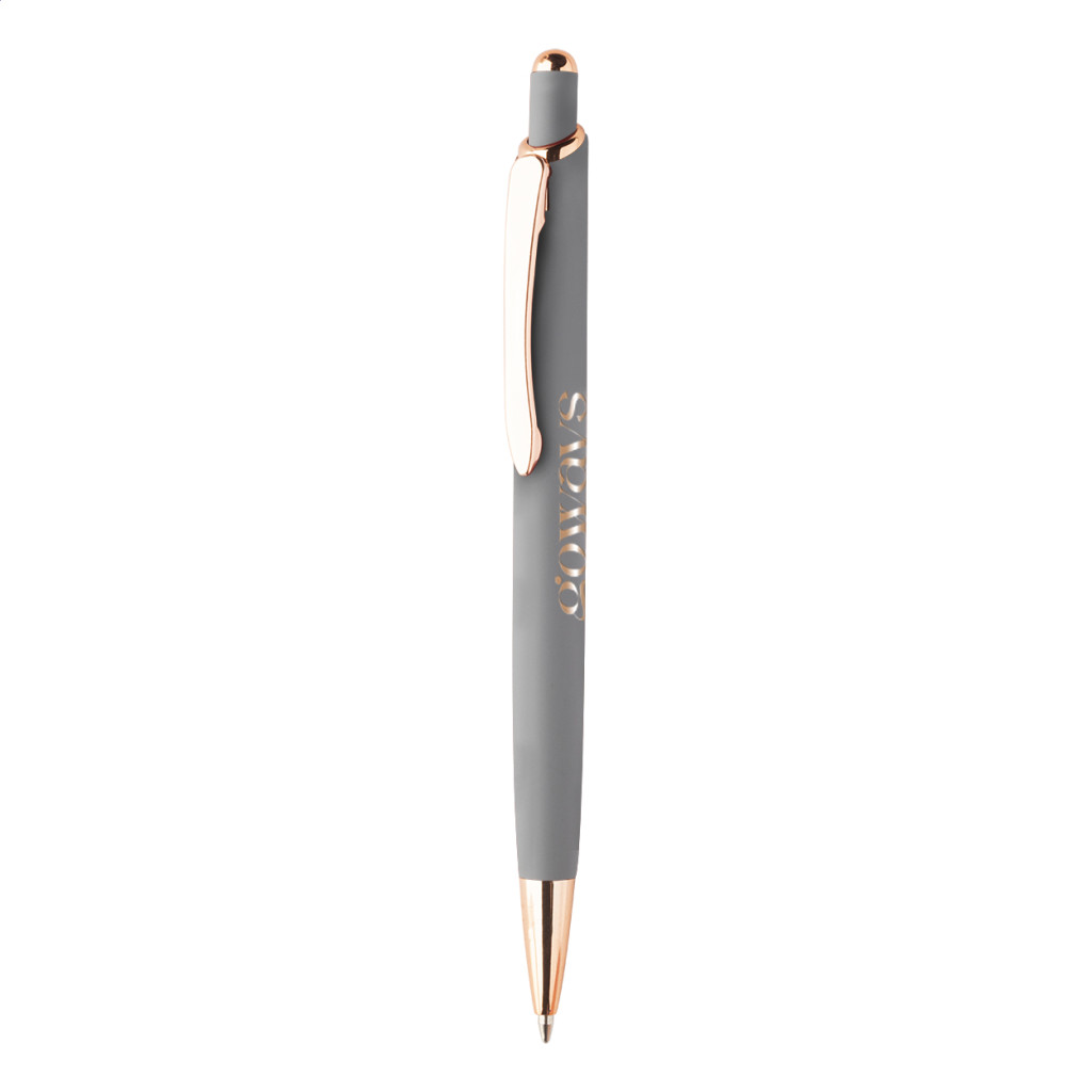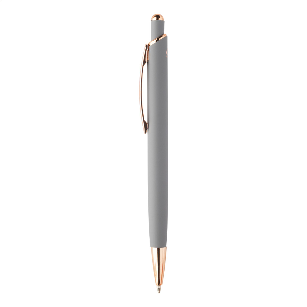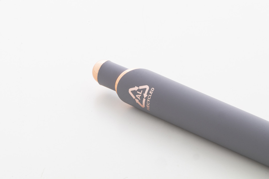 Újrahasznosított alumínium golyóstoll gumírozott felülettel és rózsaarany részletekkel. Speciális bevonattal rendelkezik a rózsaarany színű tükörgravírozáshoz. Kék tollbetéttel.