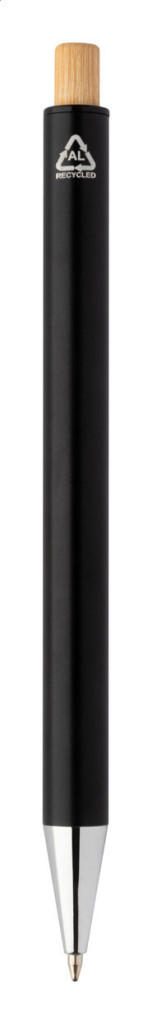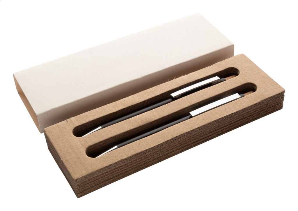 Újrahasznosított alumínium tollszett golyóstollal és töltőceruzával, bambusz gombokkal. Kék tollbetéttel és 0,7 mm-es heggyel. Kraft papír dobozban.