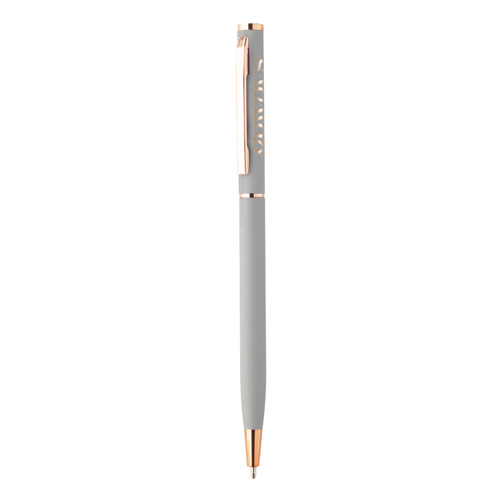 Újrahasznosított alumínium tekerős golyóstoll gumírozott felülettel és rózsaarany részletekkel. Speciális bevonattal rendelkezik a rózsaarany színű tükörgravírozáshoz. Kék tollbetéttel.