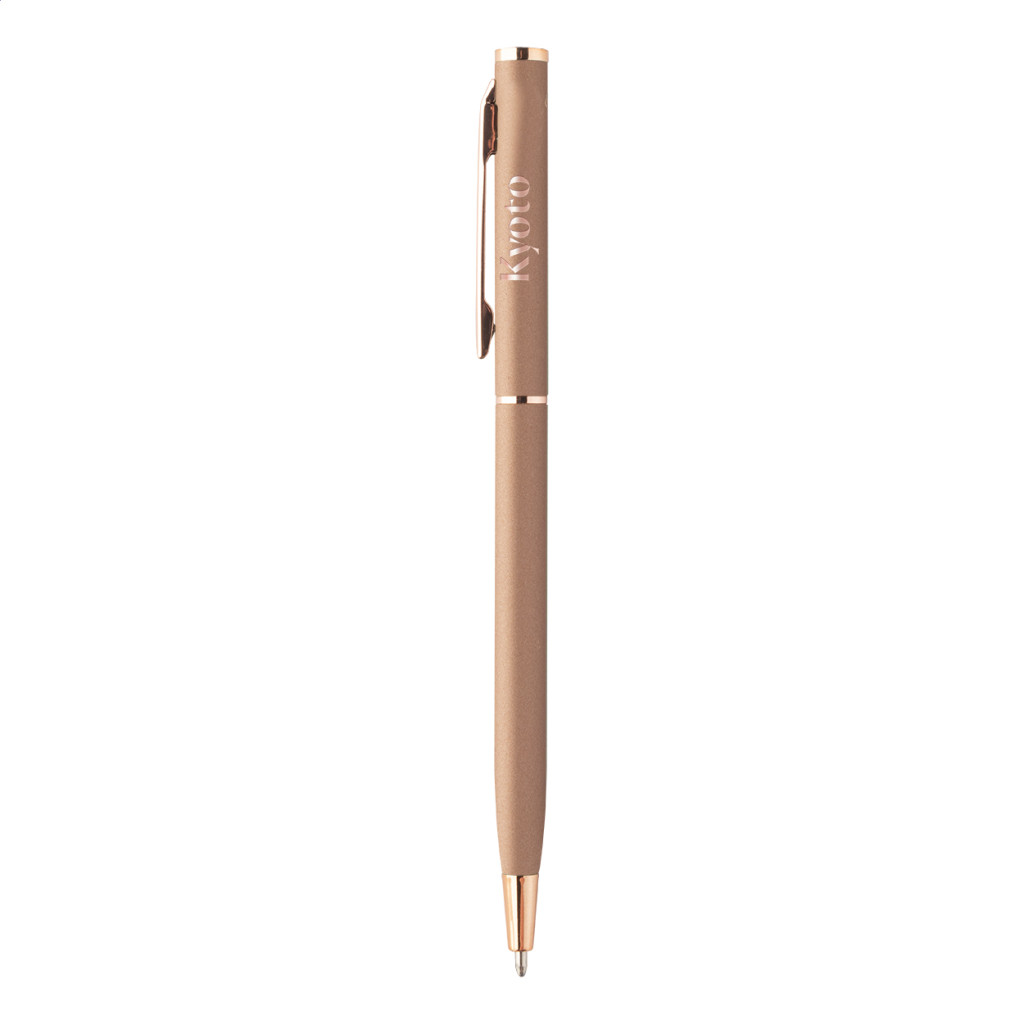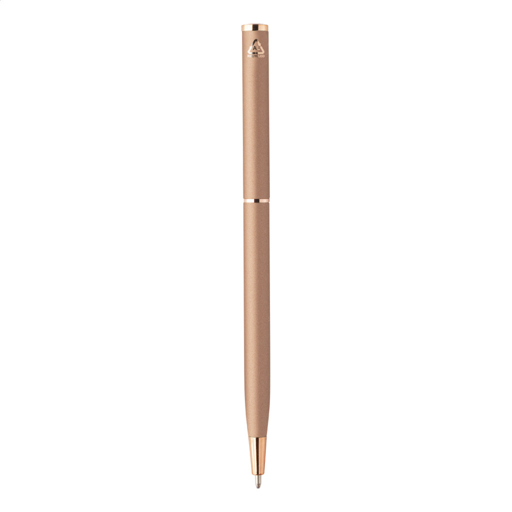 Újrahasznosított alumínium tekerős golyóstoll gumírozott felülettel és rózsaarany részletekkel. Speciális bevonattal rendelkezik a rózsaarany színű tükörgravírozáshoz. Kék tollbetéttel.