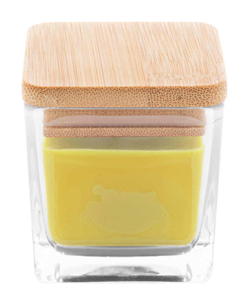 Növényi alapú illatgyertya bambusz fedelű üvegtartóban, 50 gramm viasszal. Égési idő: 8 óra. Kraft papír dobozban.
