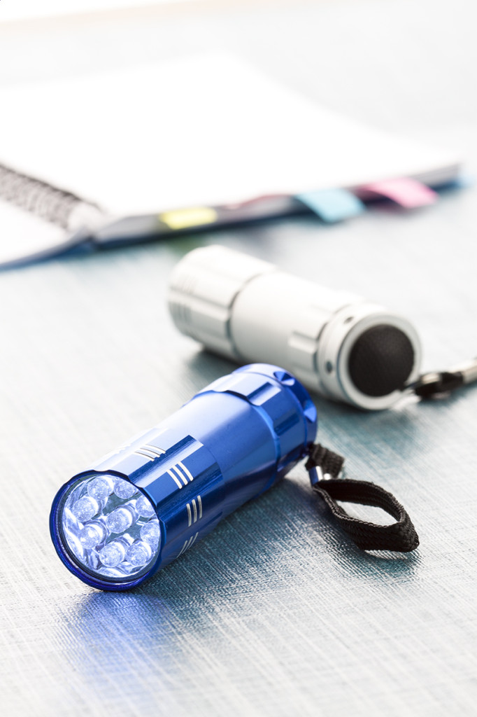 Fehér fénnyel világító, 9 LED-es fém zseblámpa, végén akasztóval. 3 db AAA elemmel szállítjuk.