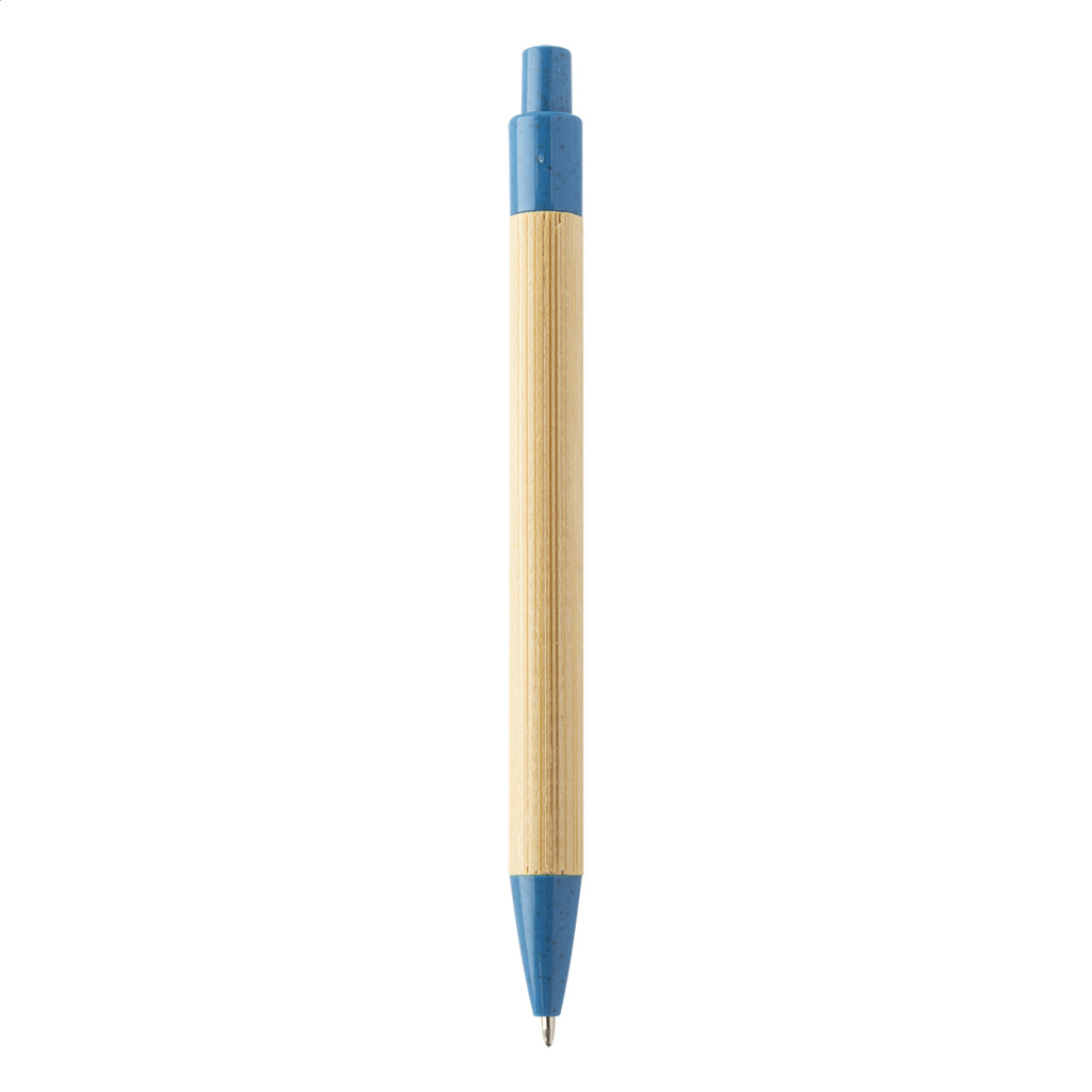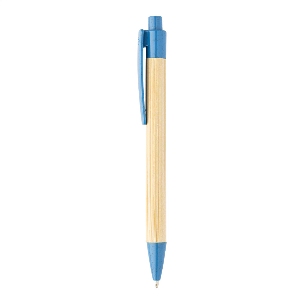 Bambusz golyóstoll környezetbarát búzaszalma műanyag klipsszel és nyomógombbal. Kék tollbetéttel szállítjuk.