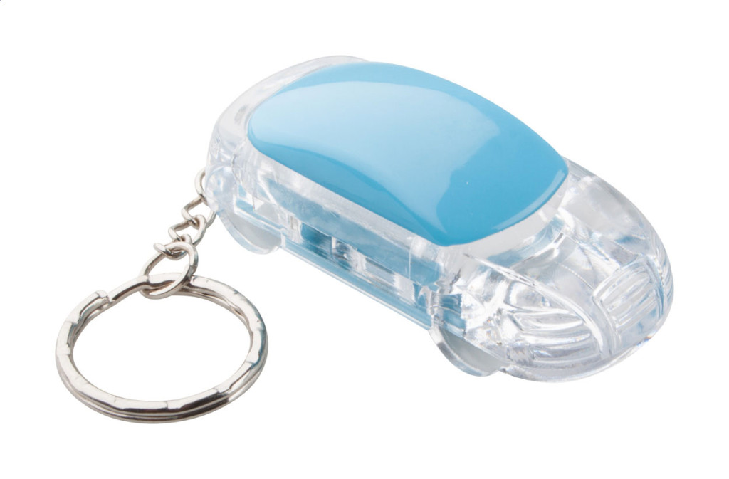 Autó formájú műanyag kulcstartó fehér LED fénnyel és fém kulcskarikával. Gombelemmel szállítjuk.