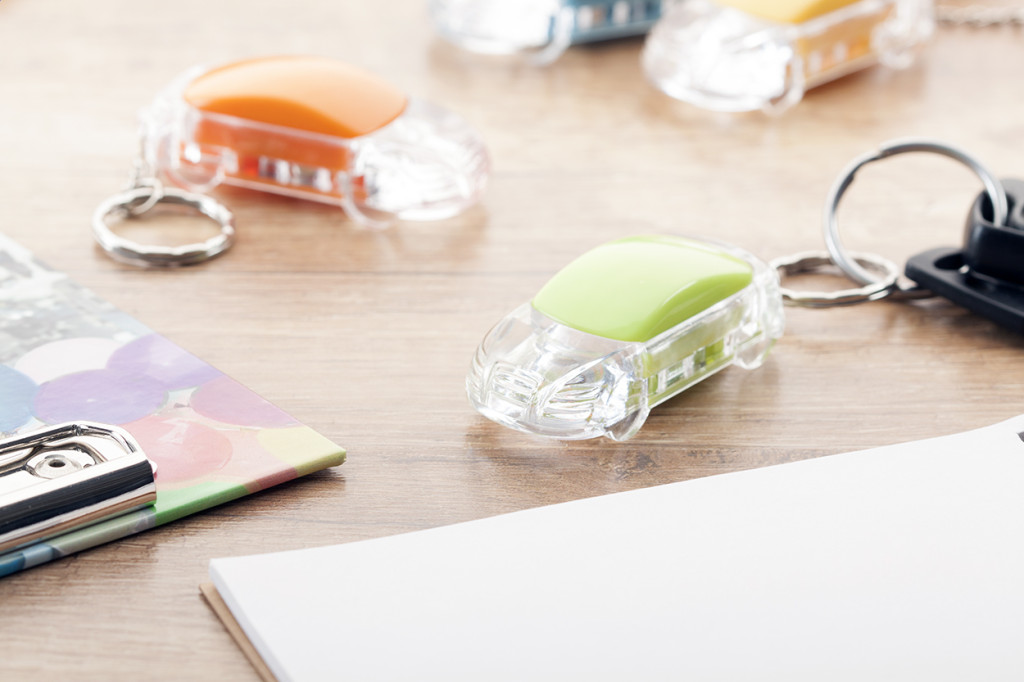 Autó formájú műanyag kulcstartó fehér LED fénnyel és fém kulcskarikával. Gombelemmel szállítjuk.