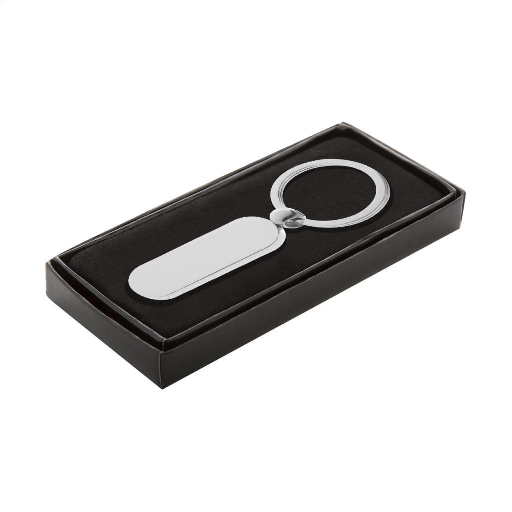 Kapszula alakú fém kulcstartó. Fekete díszdobozban szállítjuk.