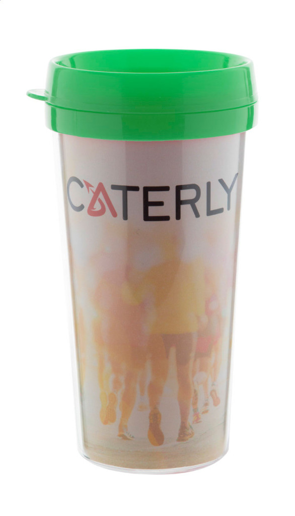 Műanyag, duplafalú thermo bögre fedelén ivónyílással. A bögre két fala közé egyedi nyomtatott grafika helyezhető. Fehér kartondobozban szállítjuk, 450 ml.