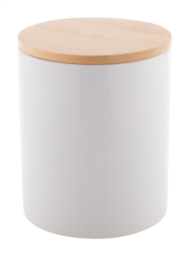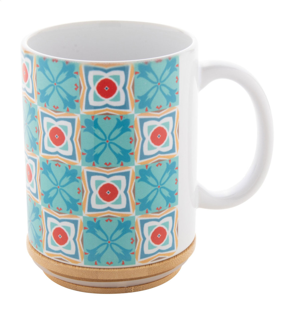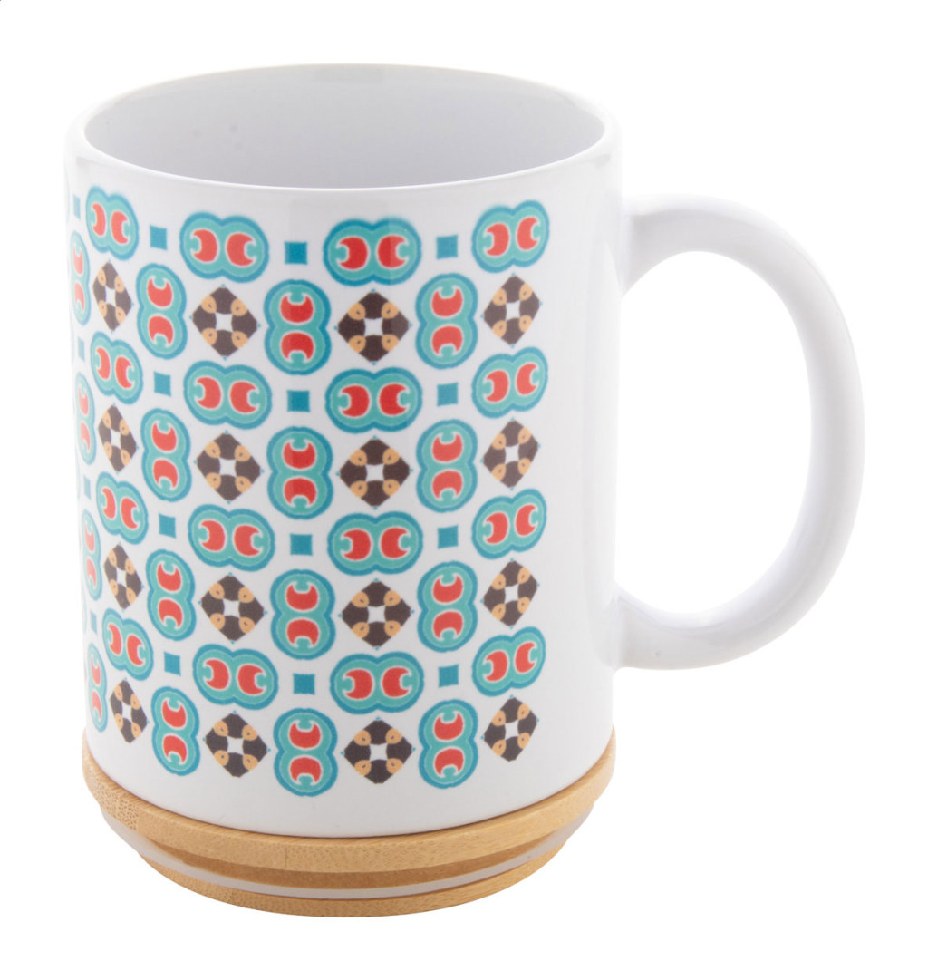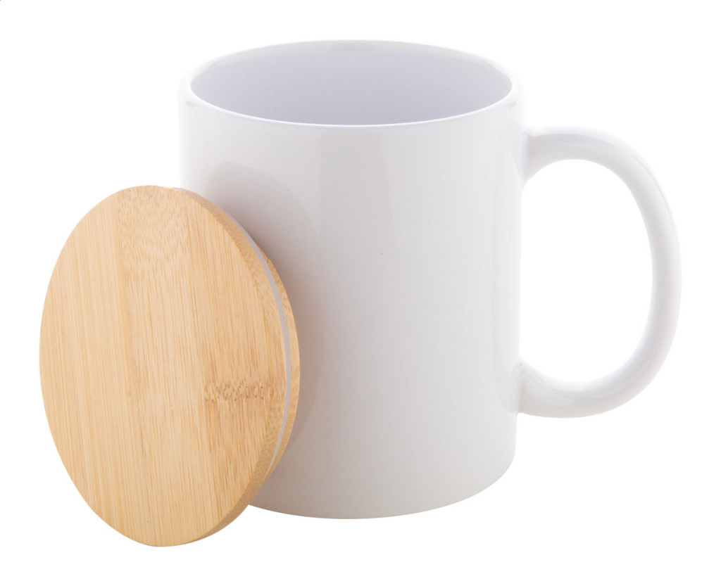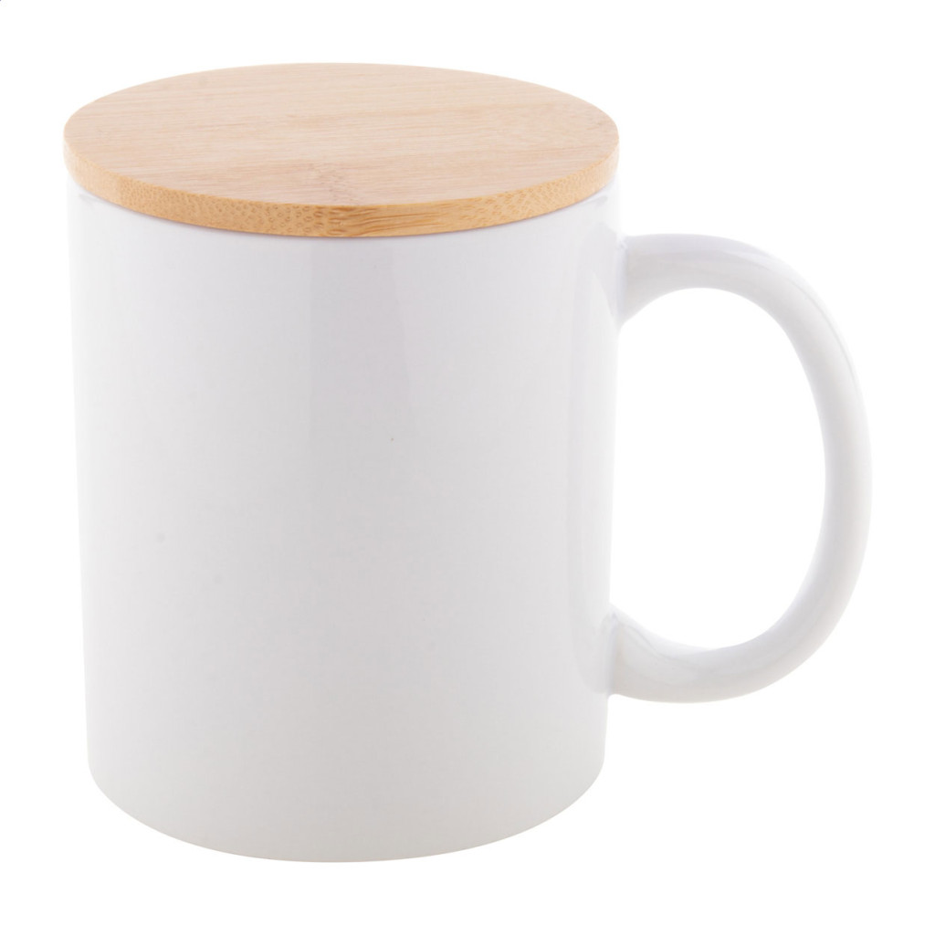 Mosogatógépben mosható fehér kerámia bögre bambuszfedéllel, szublimációs emblémázáshoz, 300 ml. Kraft papír dobozban szállítjuk.