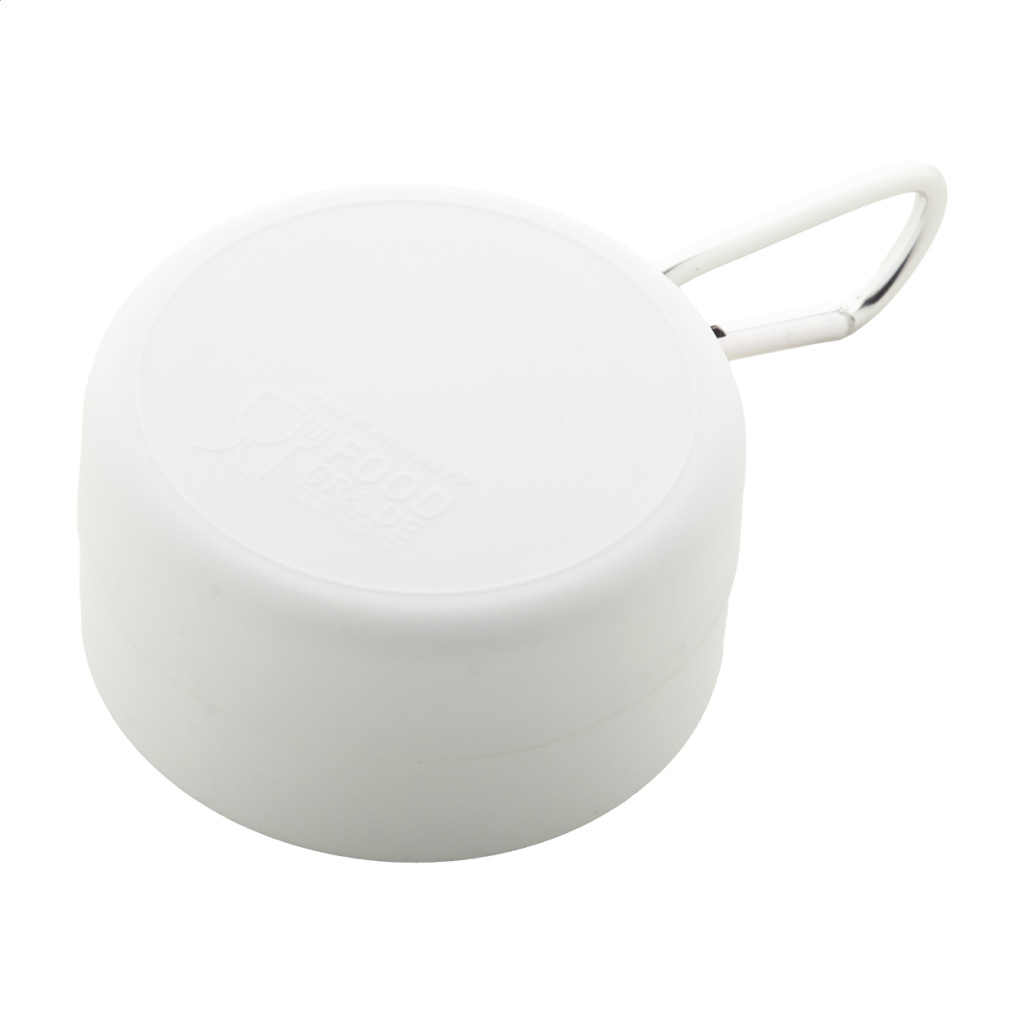 Újrahasznosított PP műanyagból készült összecsukható pohár gyógyszertároló rekesszel és fém karabinerrel. 220 ml. BPA mentes.
