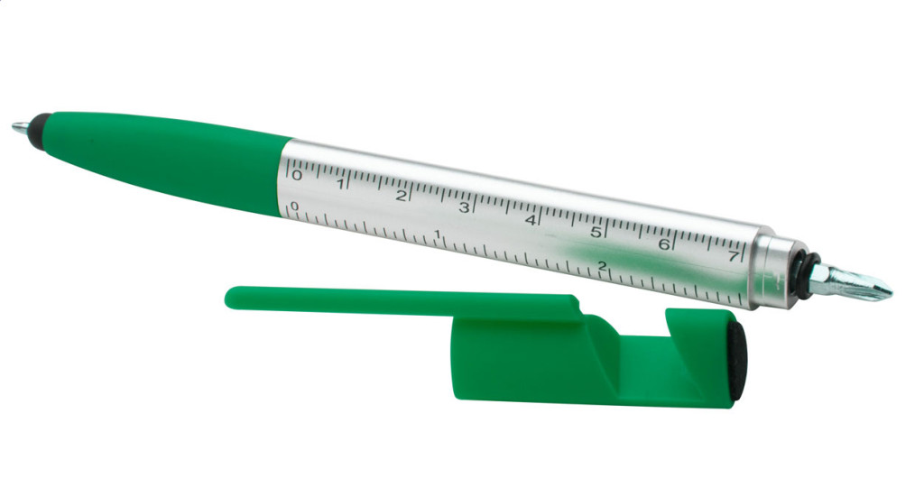5 az 1-ben műanyag érintőképernyős golyóstoll, az alábbi funkciókkal: mobiltelefon-tartó, vonalzó, képernyőtisztító és csavarhúzó. Kék tollbetéttel szállítjuk.