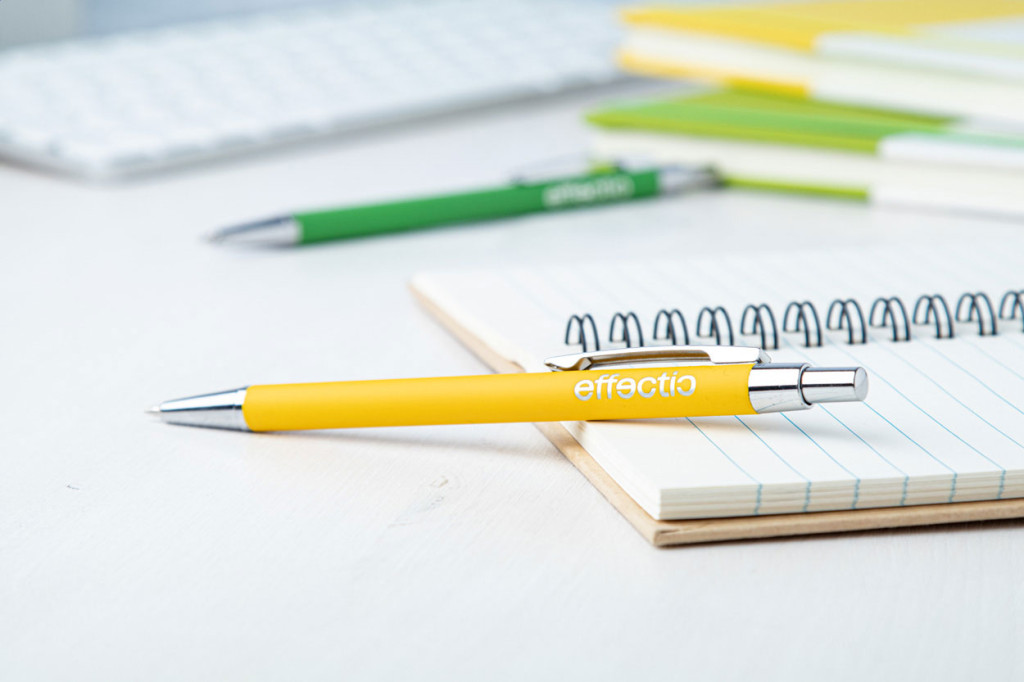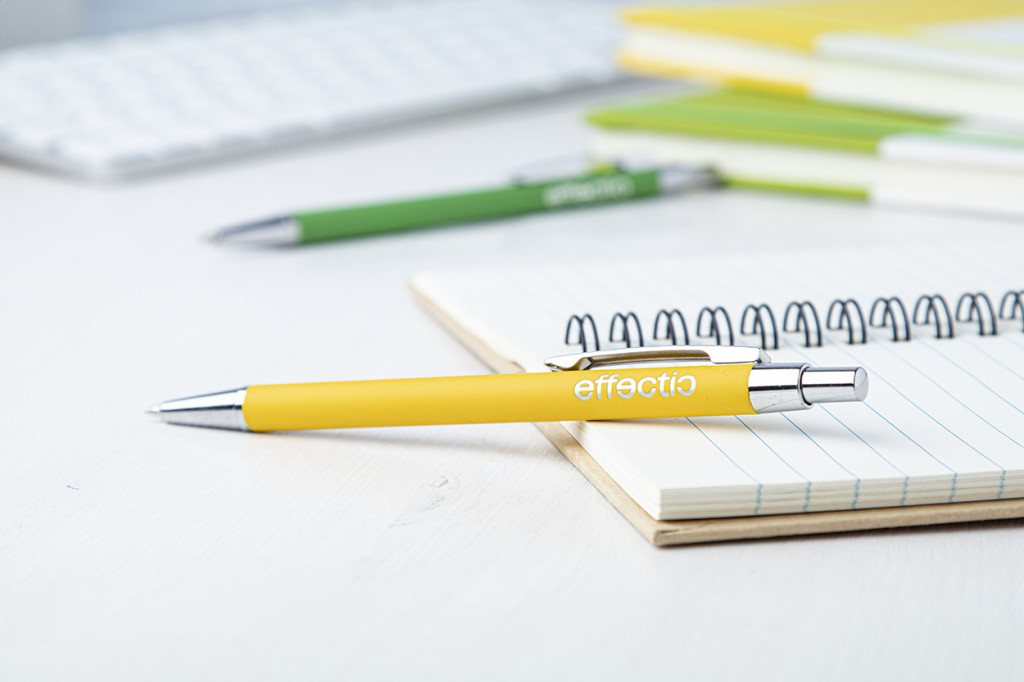 Alumínium golyóstoll gumírozott felülettel. Kék tollbetéttel szállítjuk. Speciális bevonattal rendelkezik, amely különlegesen fényessé teszi a gravírozott emblémát.