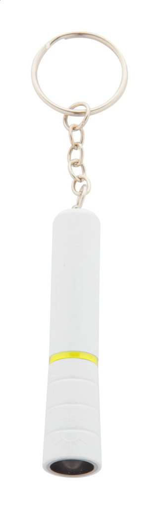 Műanyag, mini zseblámpa LED fénnyel és fém kulcstartóval. Gombelemmel szállítjuk.