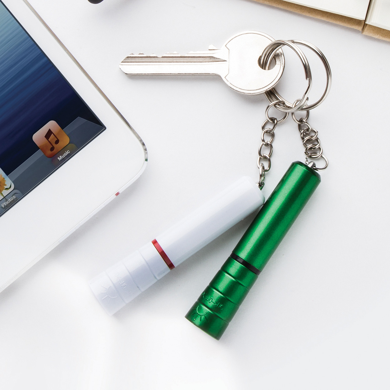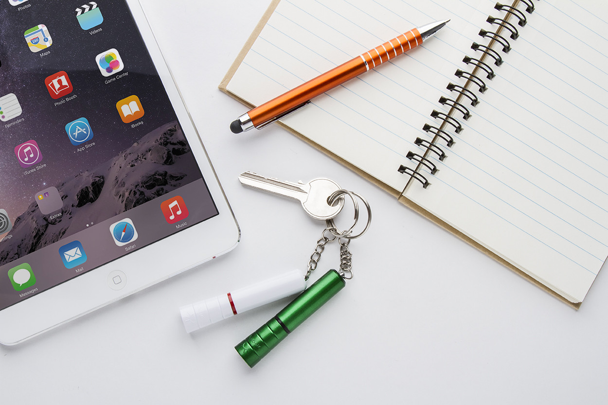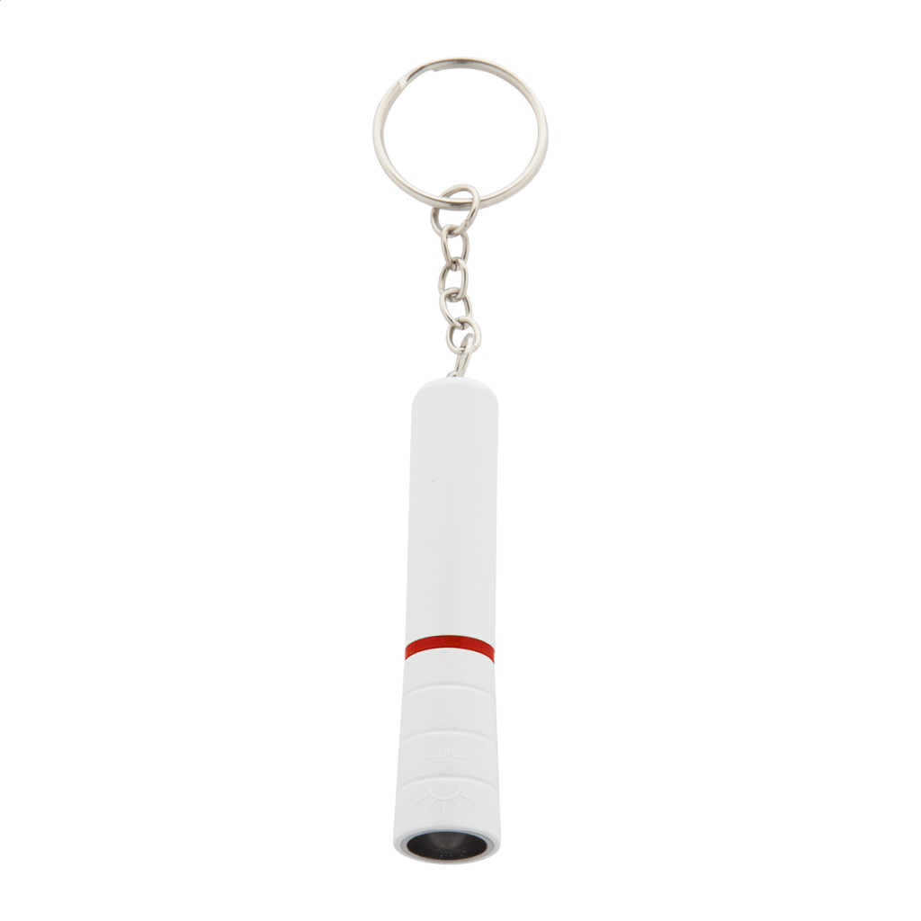Műanyag, mini zseblámpa LED fénnyel és fém kulcstartóval. Gombelemmel szállítjuk.