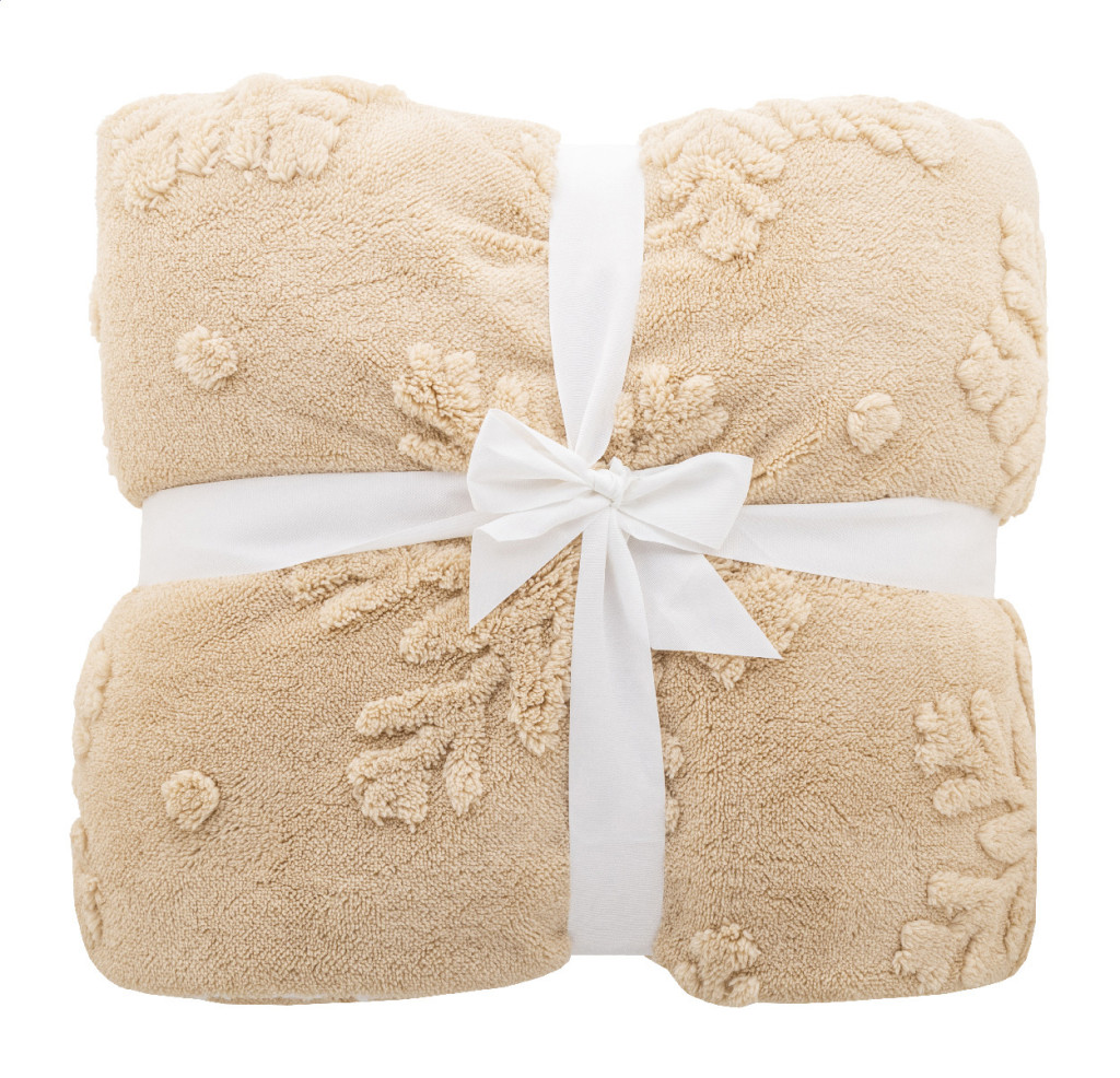 Luxus, kétrétegű RPET karácsonyi takaró jacquard hópehely mintával. 260 g/m² RPET korall polár és megfordítható 210 g/m² RPET sherpa polár béléssel. Szalaggal és nyomtatható papírkártyával csomagolva.
