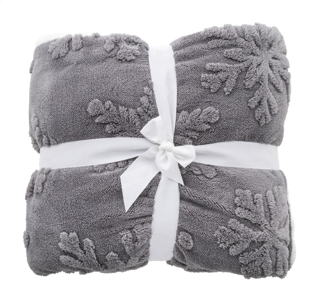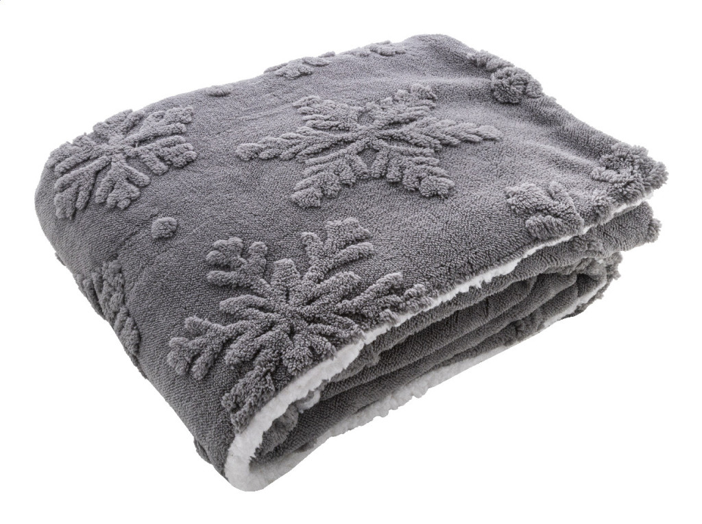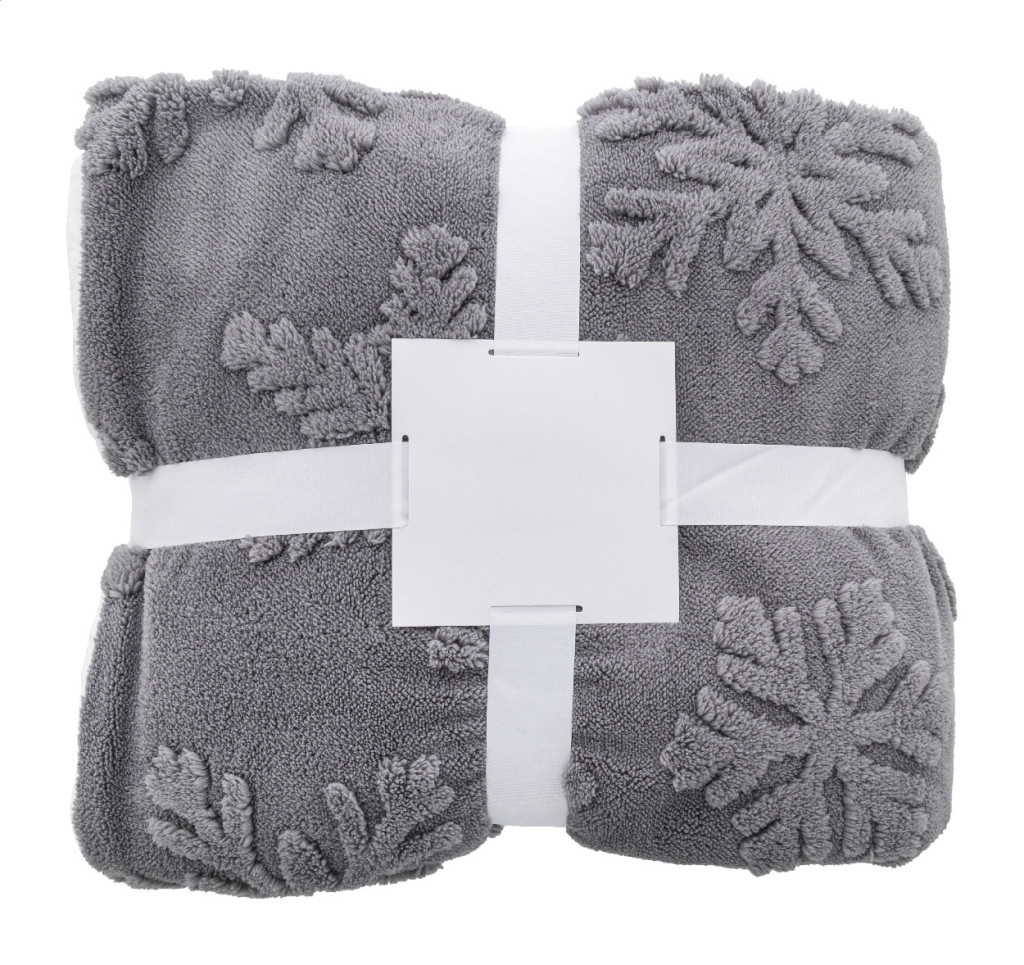 Luxus, kétrétegű RPET karácsonyi takaró jacquard hópehely mintával. 260 g/m² RPET korall polár és megfordítható 210 g/m² RPET sherpa polár béléssel. Szalaggal és nyomtatható papírkártyával csomagolva.