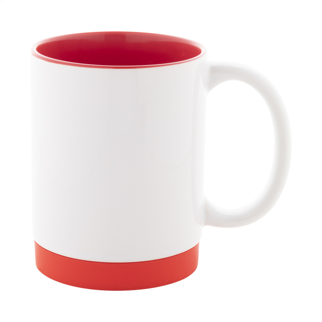 Szublimációs kerámia bögre színes belsővel, alján hozzáillő színű szilikon gyűrűvel, 300 ml. Fehér papírdobozban.