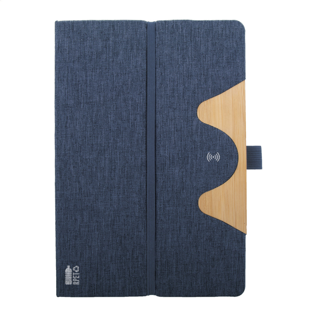 RPET poliészter borítású jegyzetfüzet bambusz betéttel, mobiltartó funkcióval és beépített vezeték nélküli gyorstöltővel (15W). 80 vonalas lappal, újrahasznosított papírból. A5 méretű. USB töltőkábellel szállítjuk.