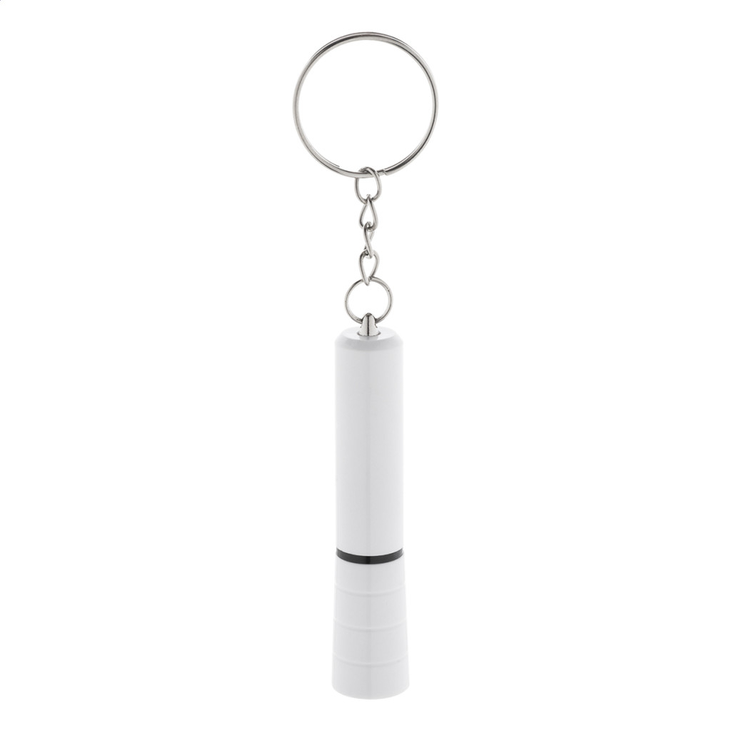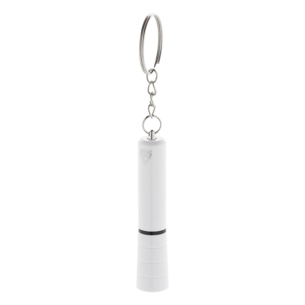 Újrahasznosított ABS műanyag, mini zseblámpa 1 LED-del, fémes felülettel és fém kulcstartóval. Gombelemmel szállítjuk.