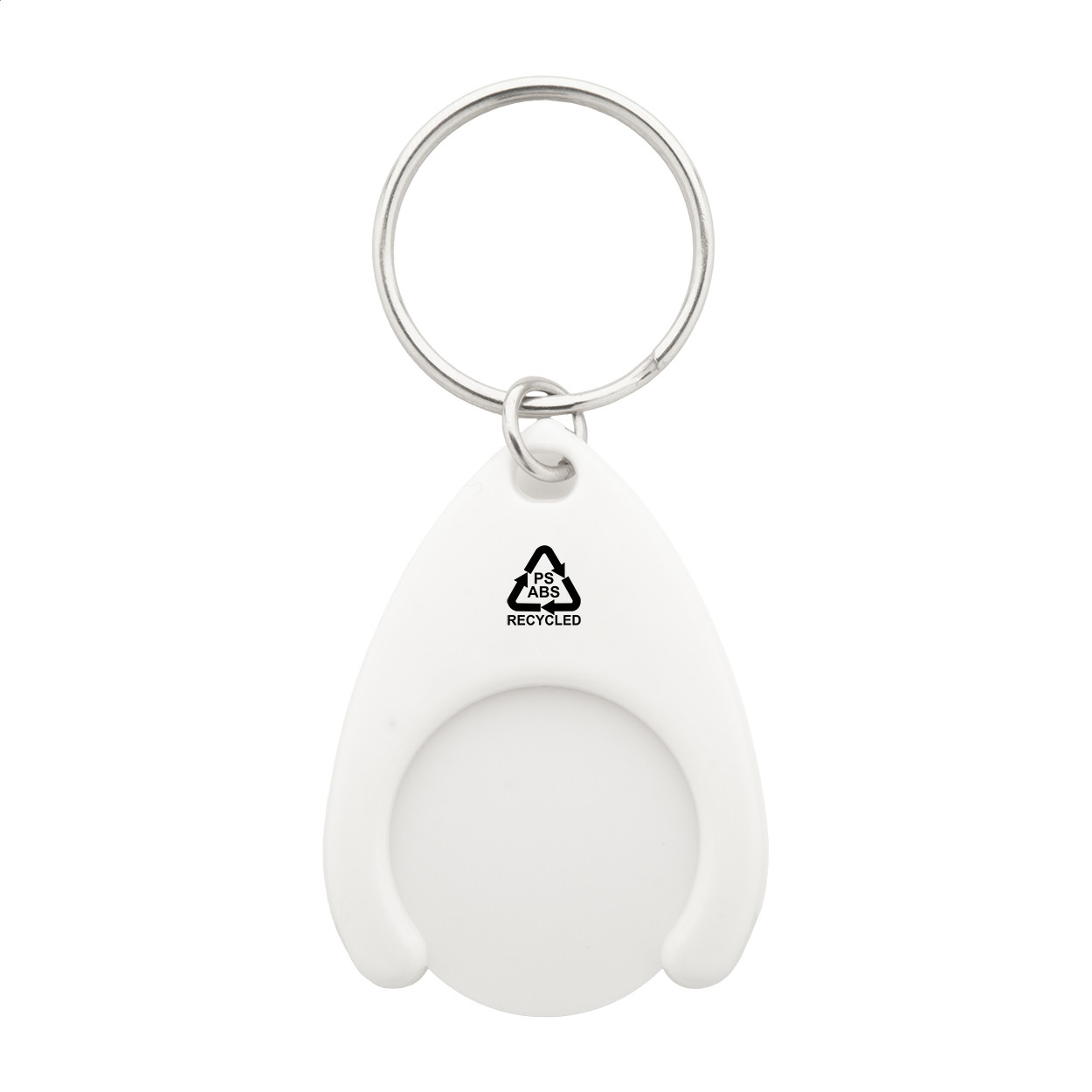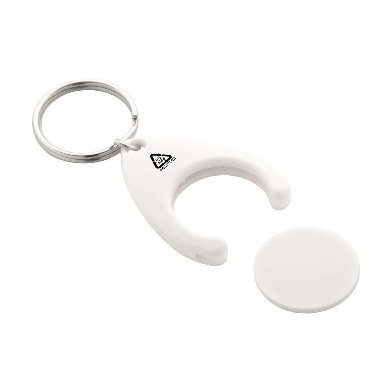 Újrahasznosított ABS és újrahasznosított PS műanyag kulcstartó bevásárlókocsi érmével és fém karikával. Érme mérete: ø24×2 mm.