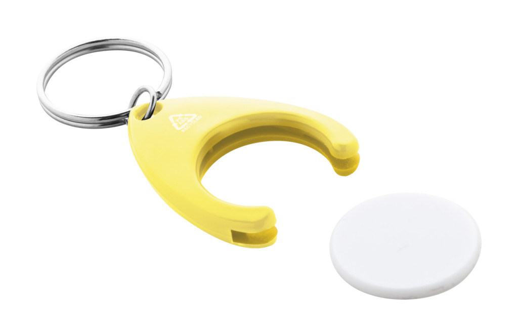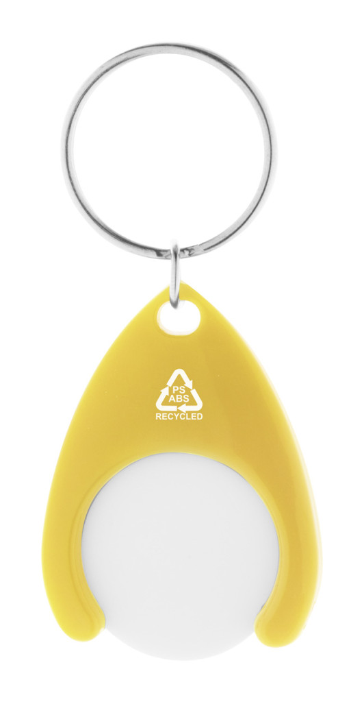 Újrahasznosított ABS és újrahasznosított PS műanyag kulcstartó bevásárlókocsi érmével és fém karikával. Érme mérete: ø24×2 mm.