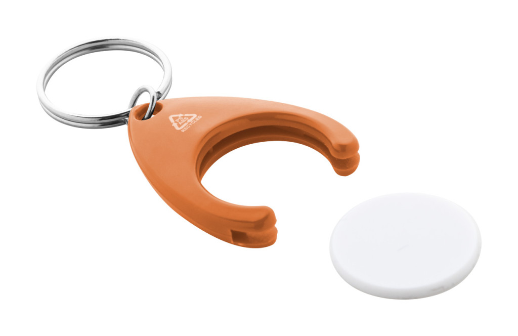 Újrahasznosított ABS és újrahasznosított PS műanyag kulcstartó bevásárlókocsi érmével és fém karikával. Érme mérete: ø24×2 mm.