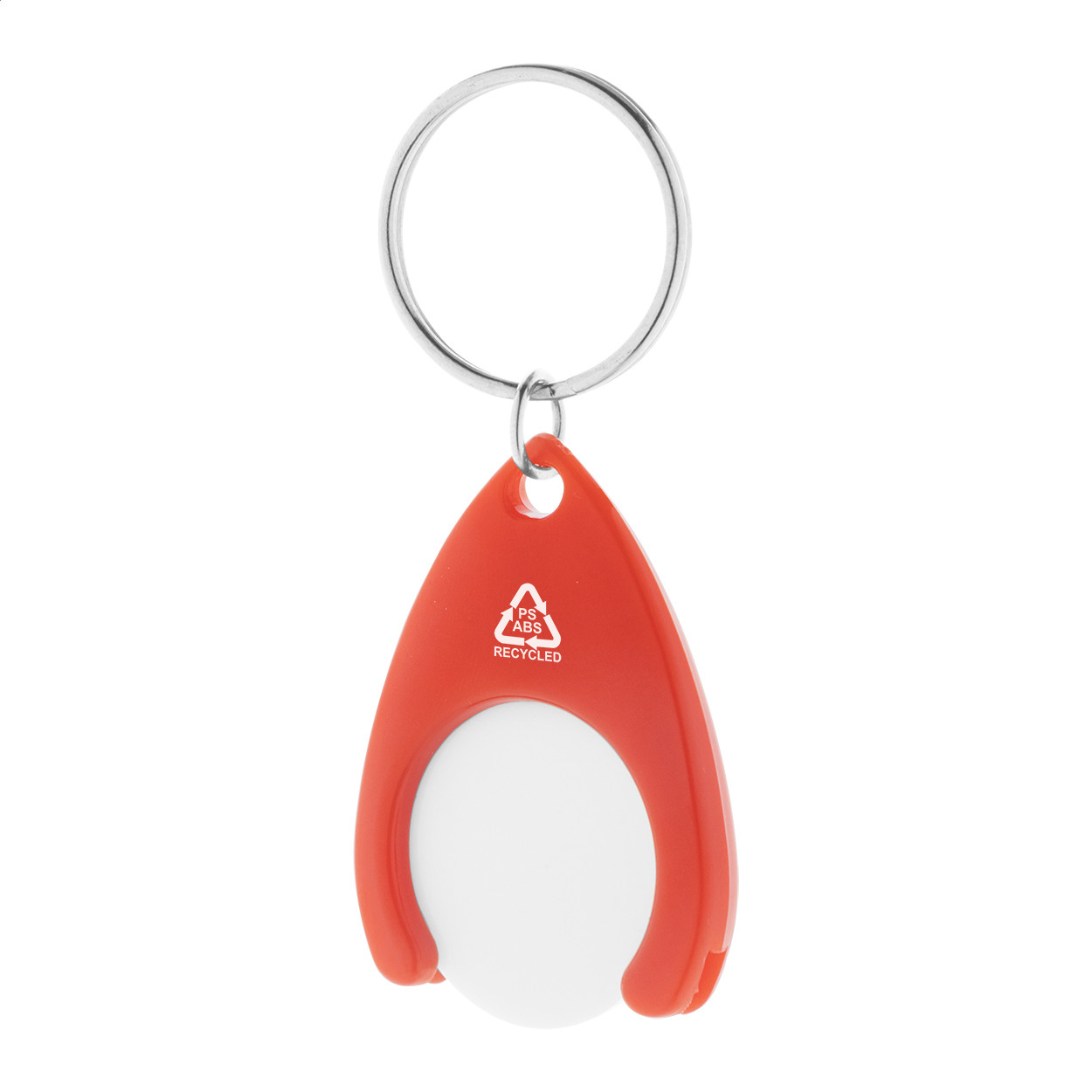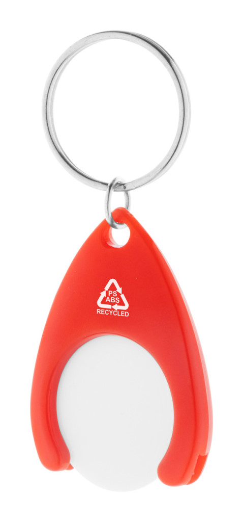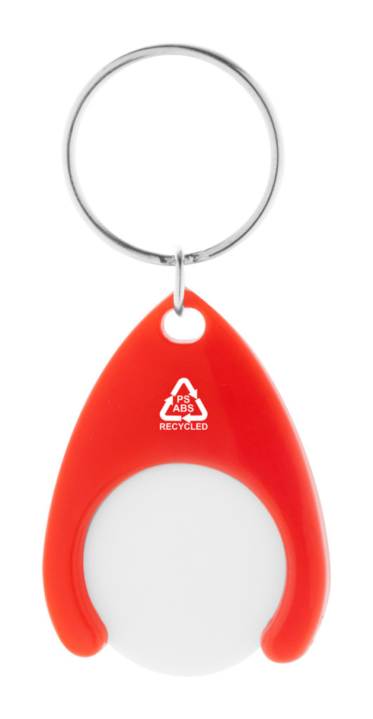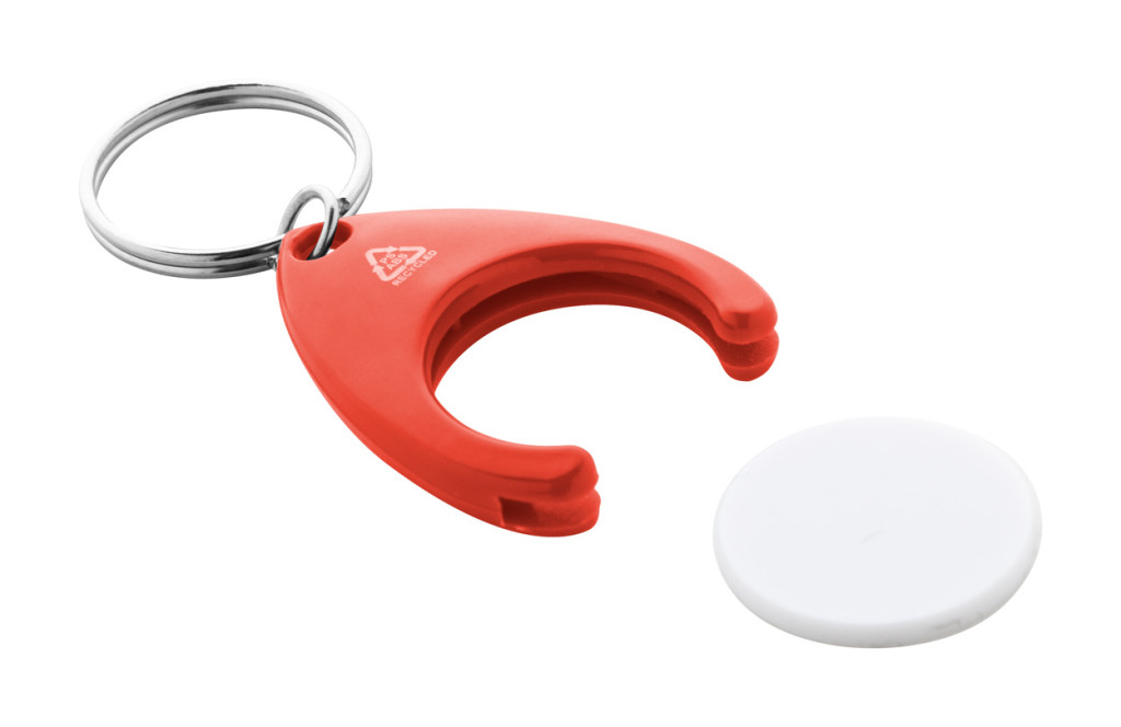 Újrahasznosított ABS és újrahasznosított PS műanyag kulcstartó bevásárlókocsi érmével és fém karikával. Érme mérete: ø24×2 mm.