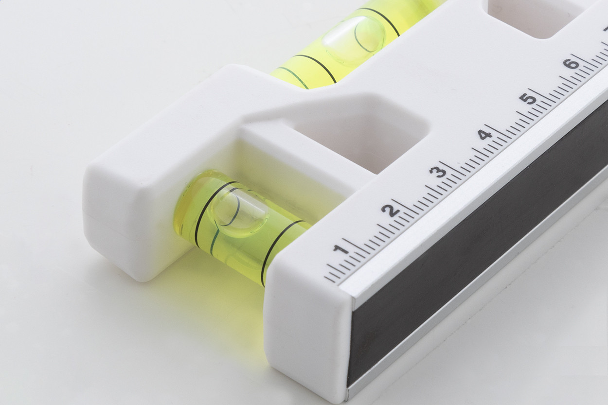 Többfunkciós, újrahasznosított ABS kulcstartó fémgyűrűvel, vonalzóval, mágnessel és kettős vízmértékkel.