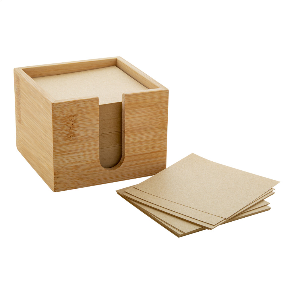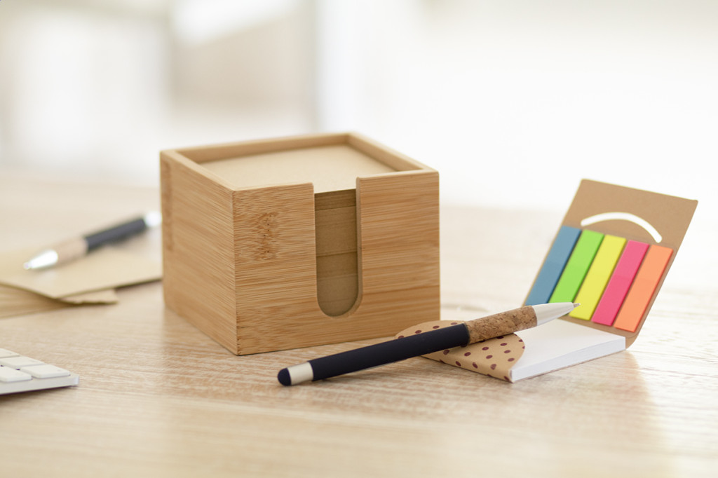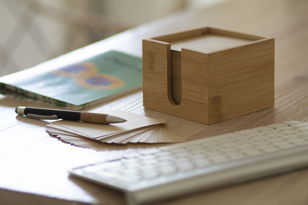Bambusz jegyzettartó, 600 darab újrahasznosított papírból álló (80 g/m²) jegyzettömbbel.